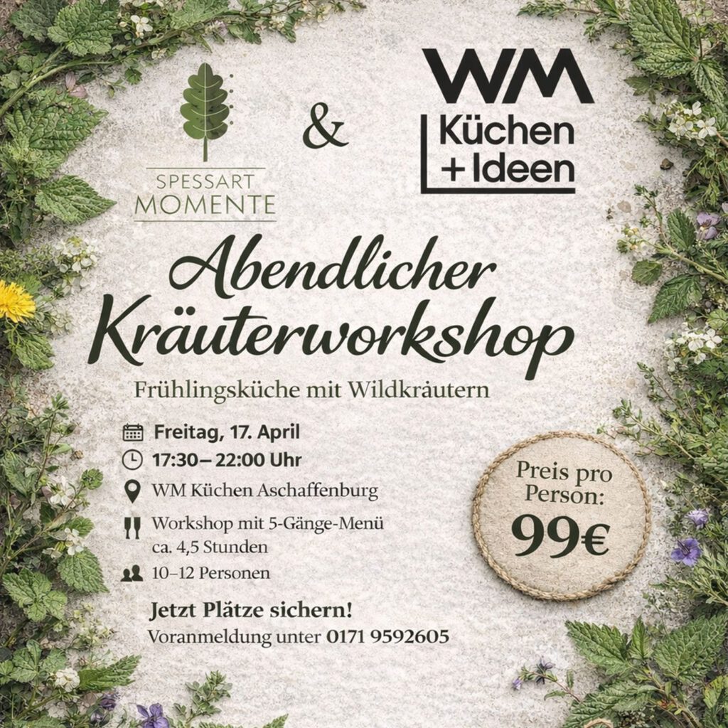 Am 17. April 2026 um 17:30 Uhr wird es in unserem Verkaufshaus in Aschaffenburg besonders aromatisch: Gemeinsam mit Spessartmomente laden wir zu einem abendlichen Kräuterworkshop rund um die Frühlingsküche mit Wildkräutern ein.